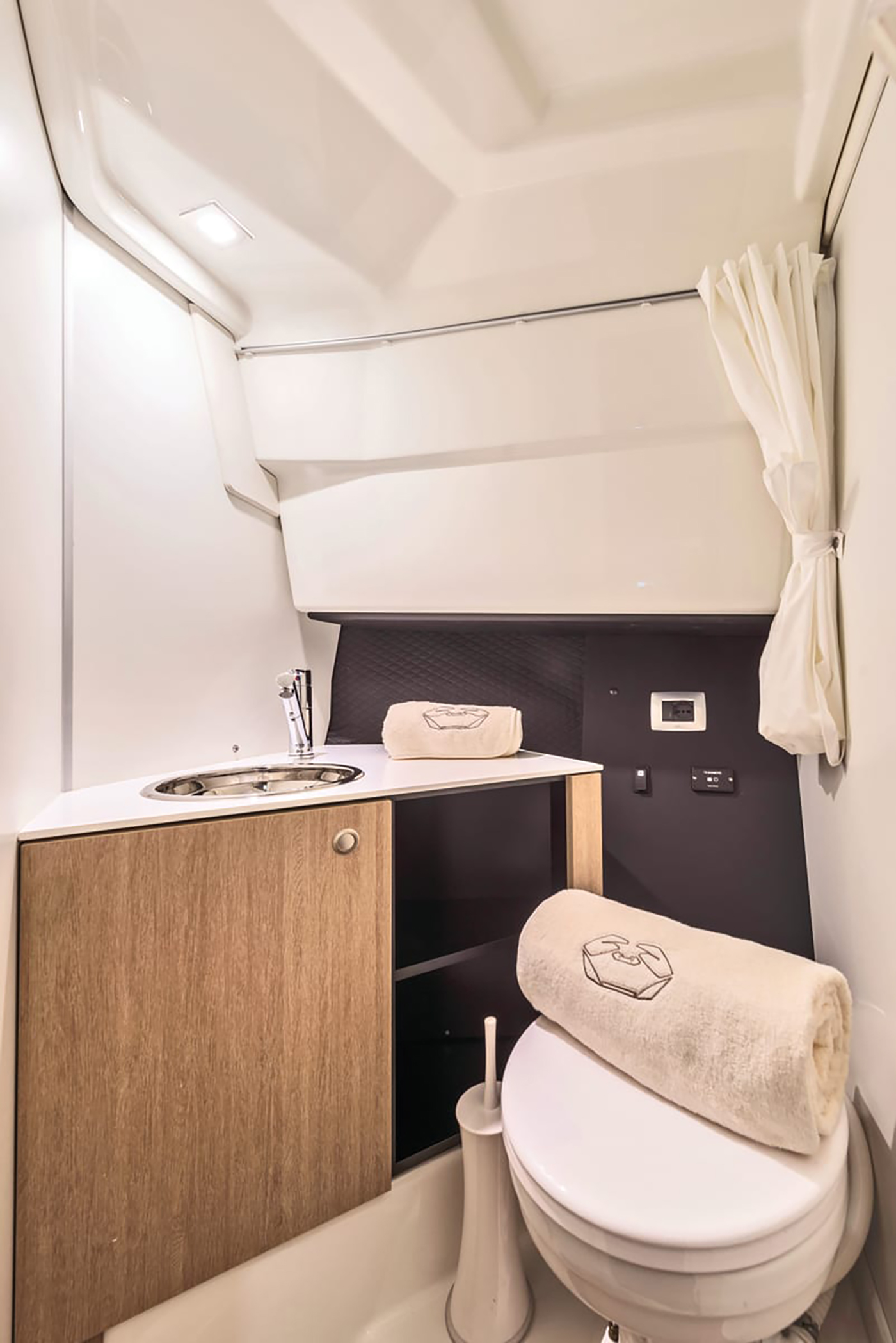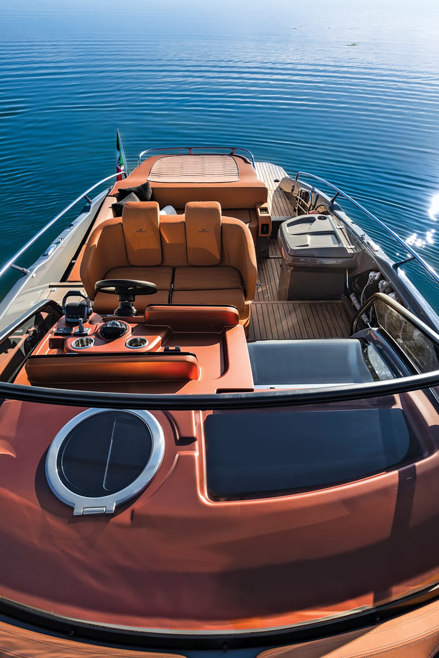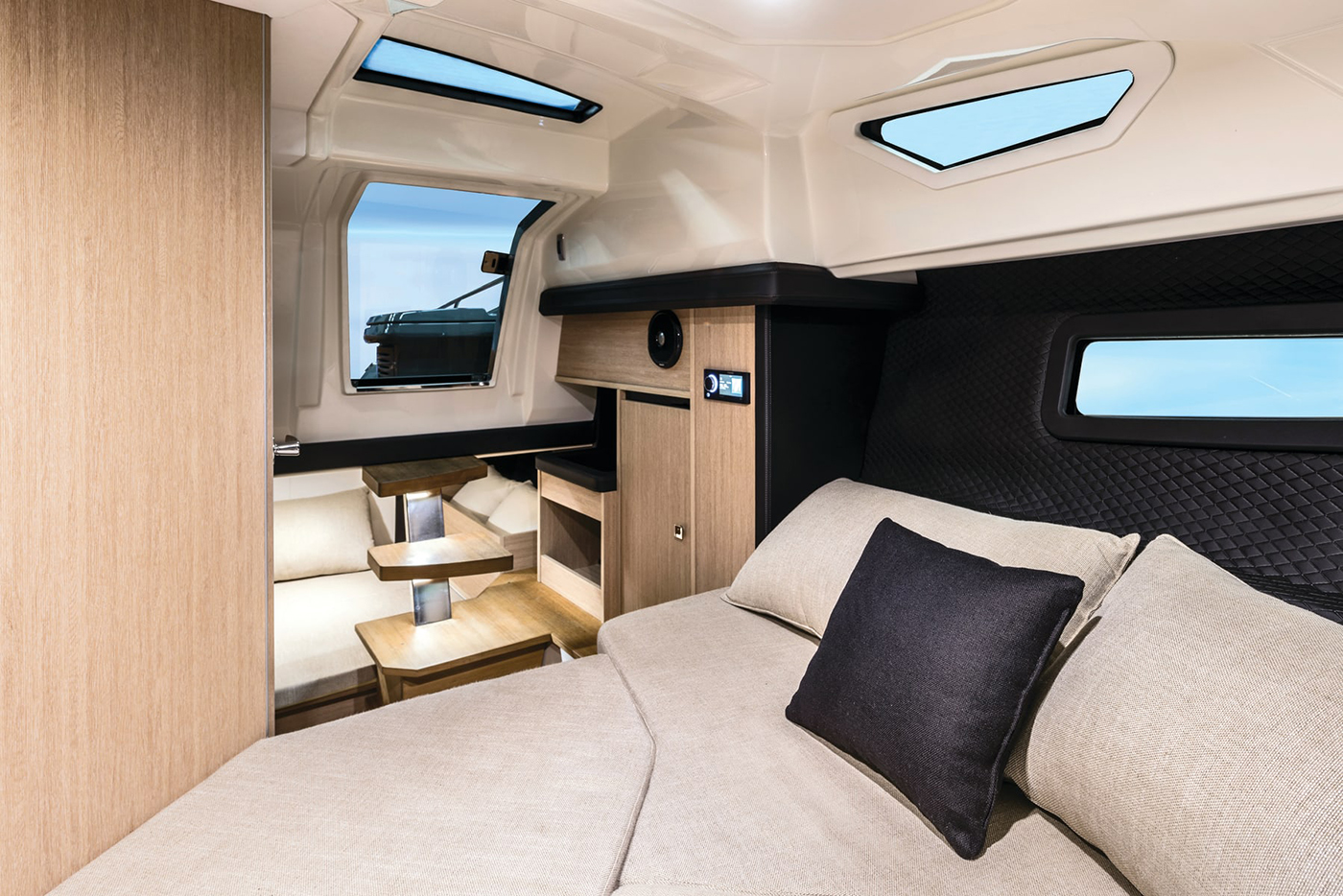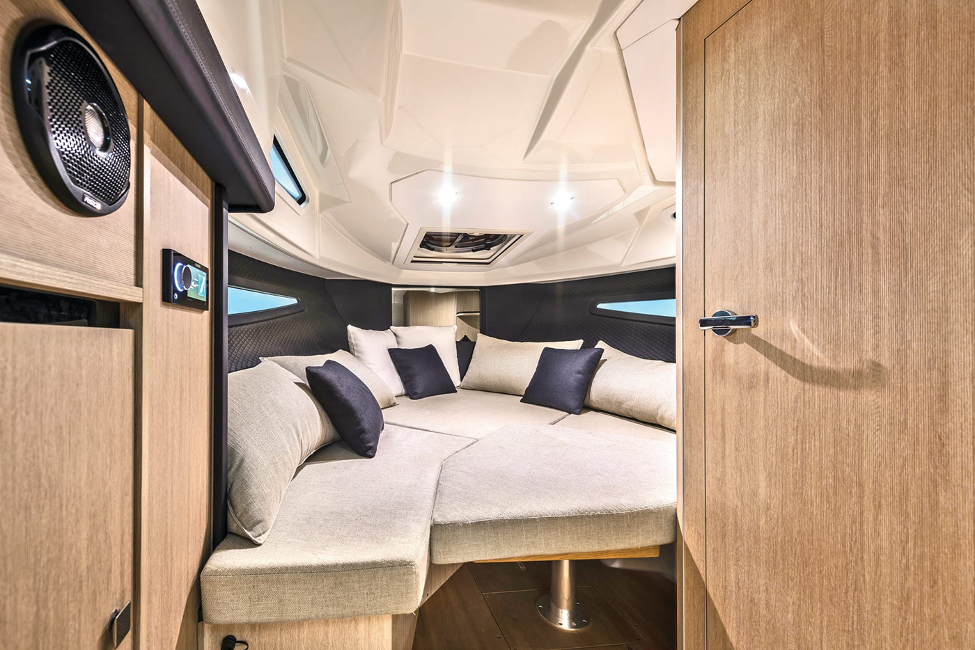 Høyden i de innvendige områdene, komfortnivået og de gjennomført elegante interiørvalgene gjør denne yachten ideell for dagsturer og lengre opphold. Rommene er lyse og luftige takket være seks lysinnslipp og en dør i pleksiglass.